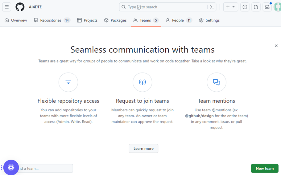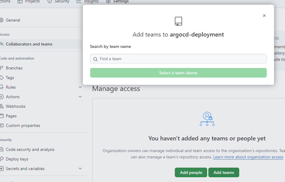 To ensure your repository is accessible within your AIOPEN workspace, make sure your repository adheres to the naming convention of using lowercase letters. Then go to the repositories main page on GitHub and click on the Settings tab. In this, select Collaborators and teams, to open the access management page. Then click Add teams and select the team that you want.