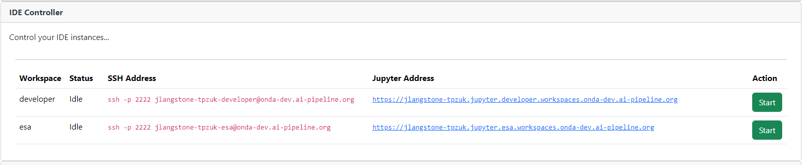 The development services UI includes an IDE controller, allowing you to manage your IDE instances. Through the IDE controller, you can start and stop your IDE and monitor it’s status in real time. It also displays essential information such as the SSH address and JupyterLab URL, giving you all the details you need to access and manage your development environment.