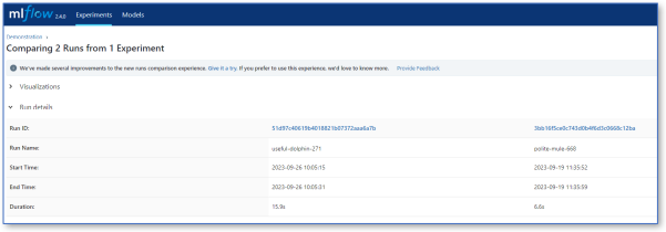 MLFlow has many features allowing you to optimize your training and compare with previous runs, as shown below.