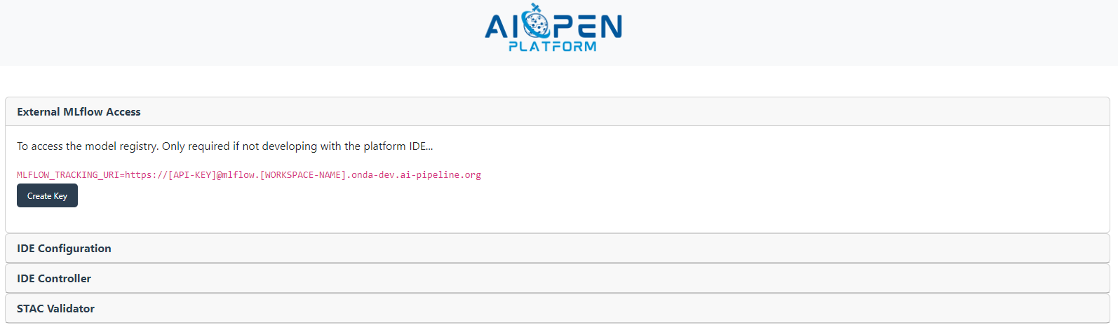 A tool for generating MLflow access keys. With such a key, a developer may train a model on his/her local system and have the session information (parameters, attributes, metrics, etc.) collected in the MLflow instance running in the AIOPEN user workspace.