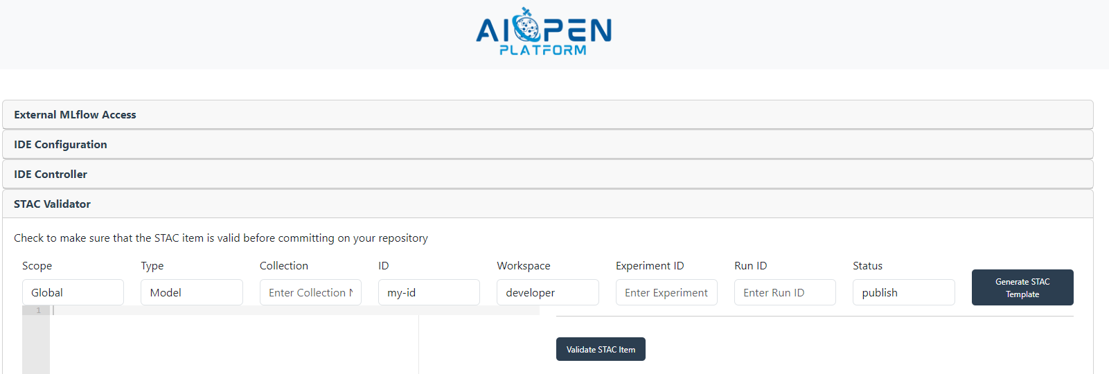 To create a STAC Item that represents a trained model, the form must be filled-in with the user workspace name, the experiment identifier and the run identifier (as found in the MLflow user interface - see Inspecting the training sessions in MLflow).