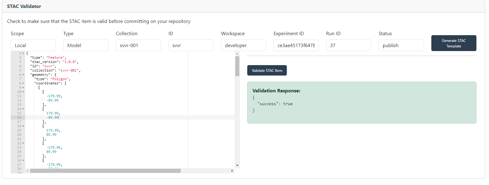 E.g. If you have a STAC extension and you have not added a REQUIRED property, then the web interface will tell you to correct it. Refer to the Sharing and Publishing section for more information on the composition of the STAC items.