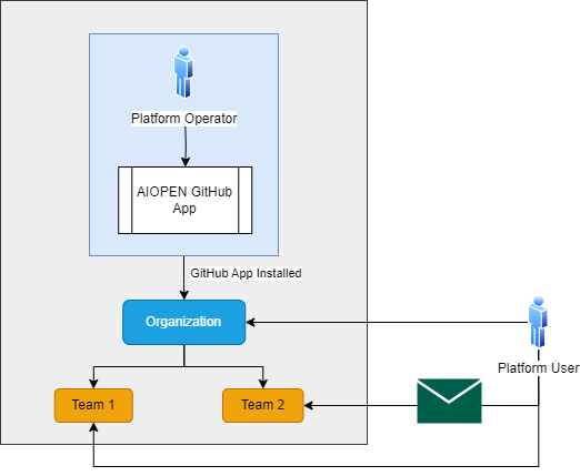 We utilize several key features from GitHub as a cornerstone of governance for AIOPEN developers. Two notable features are GitHub Organizations and GitHub Teams. An organization on GitHub is a shared account where businesses and open-source projects can collaborate across many projects at once. Members can then be organized into teams within the organization with different permissions across all repositories within the organization. To utilize the AIOPEN platform as a developer, you must have an active GitHub account and be a member of a GitHub organization. This organization will have been configured by the AIOPEN platform operator with a GitHub App, which is essentially a webhook to link the AIOPEN platform with the GitHub organization. This is a public App that is not on the marketplace but is provided via a public link. At this point, AIOPEN platform will be listening to the GitHub organization for any activity. The operator will then create a workspace custom resource within the cluster aligned with the organization/team for the developer/s to work in, alongside all the resources that come with being part of a workspace.