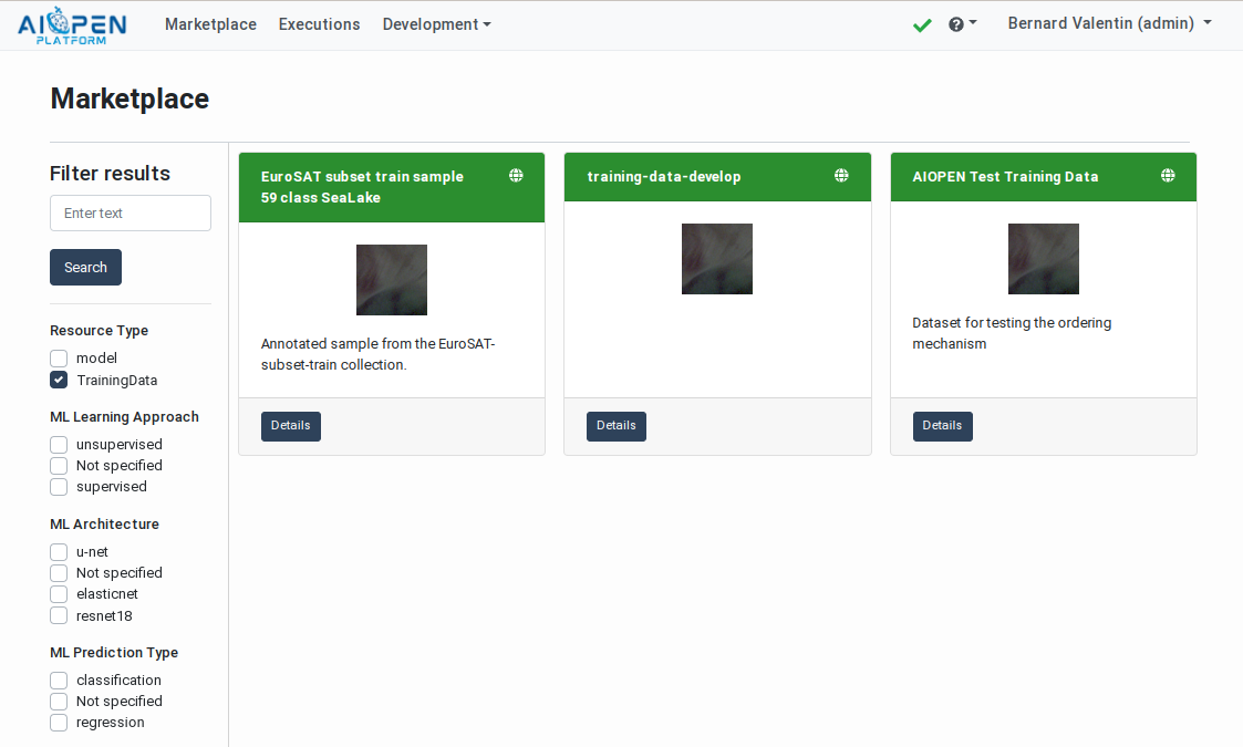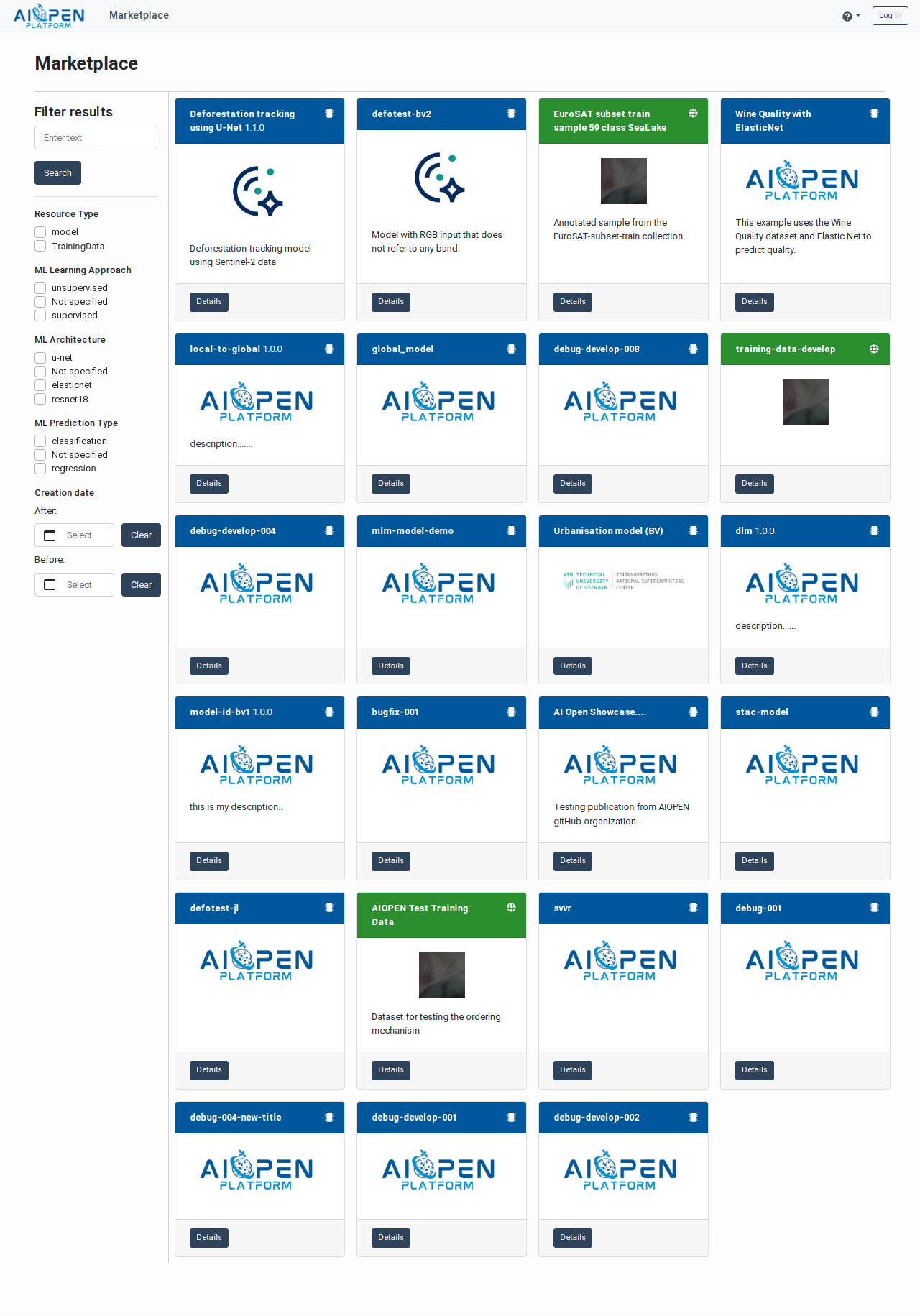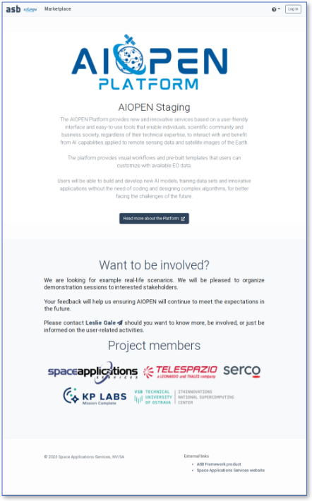 The entry point to the AIOPEN Exploitation Service is the Marketplace which is accessible at https://aiopen.spaceapplications.com .