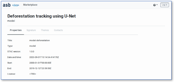 Note: The “Raw JSON” panel displays the JSON-encoded STAC descriptor in which the model properties are encoded. A more user friendly display will be added in the future.