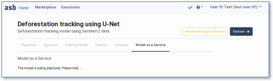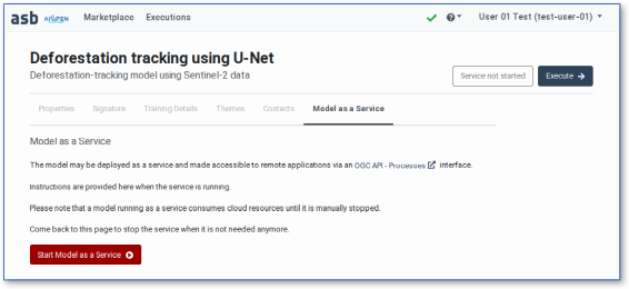 Authenticated users may discover the published resources, and execute trained models to obtain predictions. Trained models may also be started as services and invoked using an OGC API Processes compatible interface.