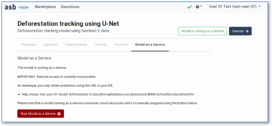 To stop the model running as a service, navigate back to the model details page, reveal the MaaS panel and click on the Stop button.