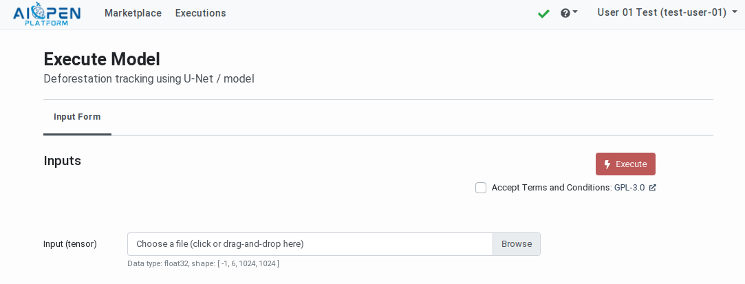 If the model requires an image as input, a Browse button allows selecting a file on the local system. The image content must match the datatype and shape expected by the model (e.g. float32 and [ -1, 6, 1024, 1024 ] for a 6 bands, 1024x1024 image with float32 pixel values). The image is uploaded, stored in AIOPEN, and converted into a tensor automatically.