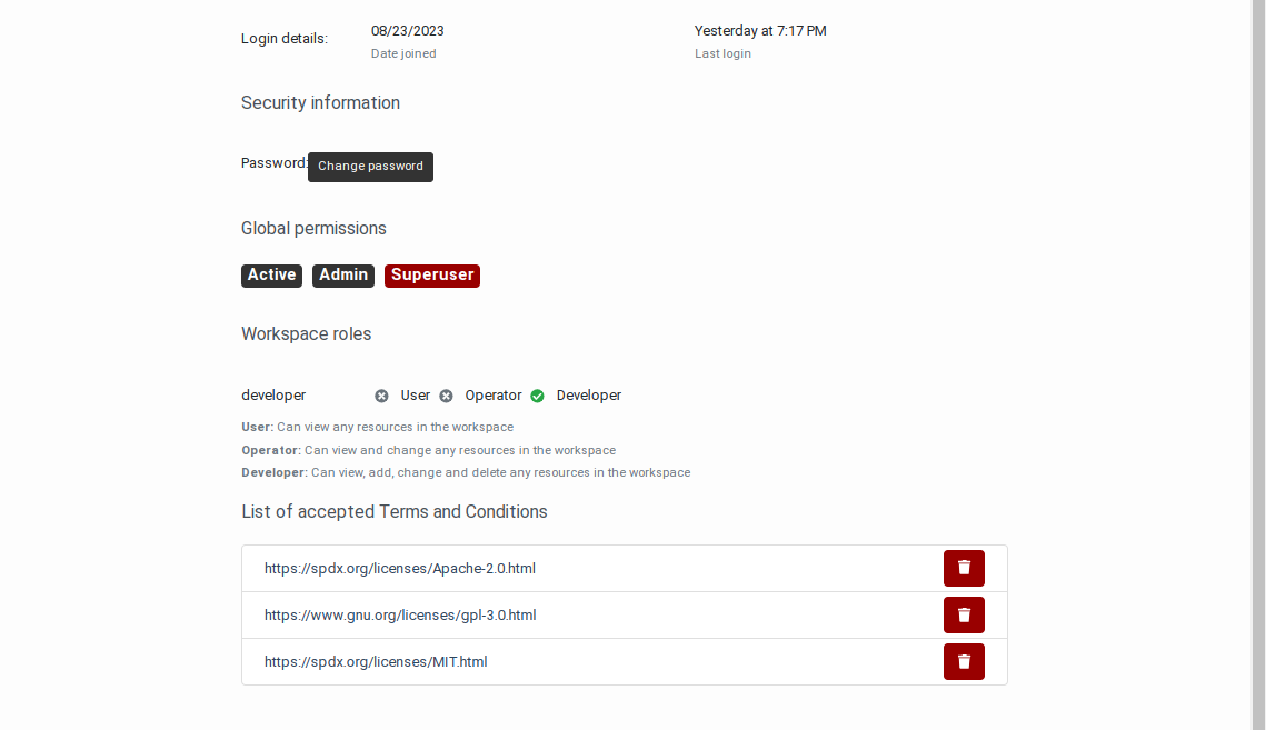 The User Profile page, accessible via the user personal menu located in the navigation bar, provides the list of accepted Terms and Conditions (T&C). Each T&C may be inspected again, using the provided external links, and revoked individually.