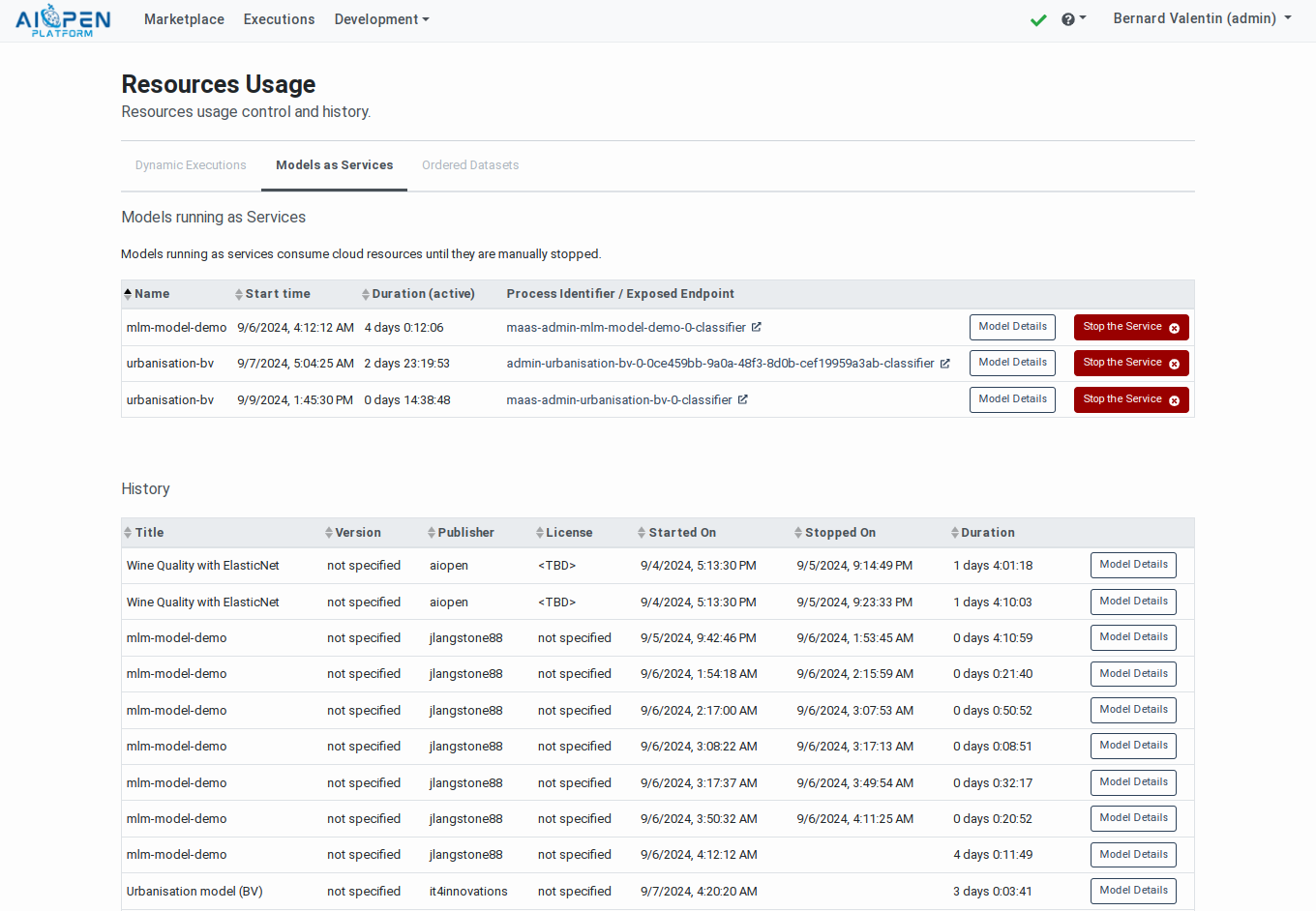 The Resources Usage Tracking page, accessible in the user menu (in the navigation bar), provides the list of models that have been, or are still, running as Services.