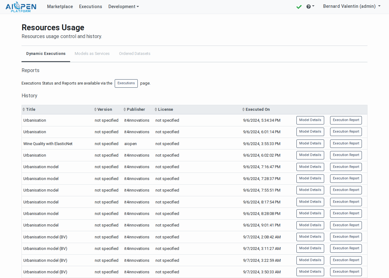 The navigation bar of regular users include an Executions tab for accessing the models executions monitoring and reports, as well as a menu for accessing personal information such as the user profile, the accepted Terms and Conditions and an history of the resources usage.