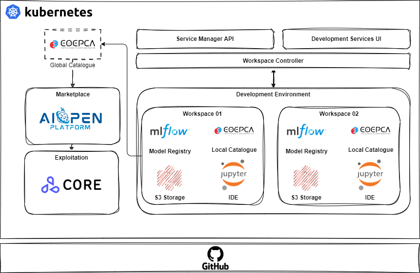 The development environment is the crucible where ideas take shape and transform into tangible AI models. It works in tandem with the Workspace Controller, which is responsible for orchestrating workspaces and resources tailored to the needs of the development teams. Each workspace comes with it’s own Model Registry, Storage, local catalogue to store developmental STAC items and dedicated IDEs.